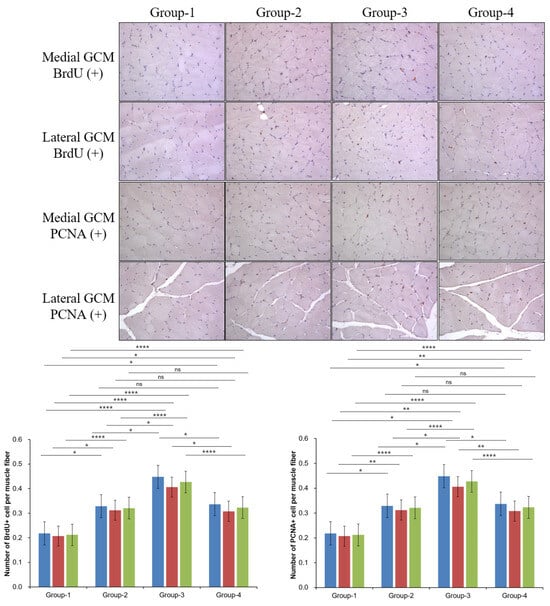 Immunohistochemical analysis of GCM (gastrocnemius muscle) fibers was conducted across the four groups, focusing specifically on immobilized GCM muscles stained with anti-BrdU and anti-PCNA antibodies. Cells or nuclei positive for BrdU and PCNA were counted along with the total number of muscle fibers within each image, Blue = med.GCM; Red = lat.GCM; Green = total GCM, * p indicates <0.05, ** p indicates <0.01, and **** p indicates <0.001 (post hoc testing between groups).