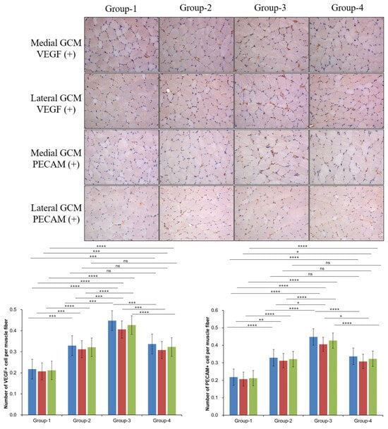 Immunohistochemical analysis of GCM (gastrocnemius muscle) fibers across the four groups involved examining immobilized GCM muscles stained with anti-VEGF and anti-PECAM-1 antibodies. The number of cells or nuclei that were positive for VEGF and PECAM-1 was counted, along with the total number of muscle fibers present in each image¸ Blue = med.GCM; Red = lat.GCM; Green = total GCM, * p indicates <0.05, ** p indicates <0.01, *** p indicates <0.001, and **** p indicates <0.001 (post hoc testing between groups).