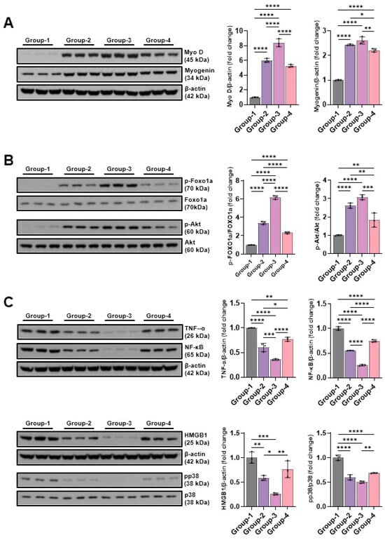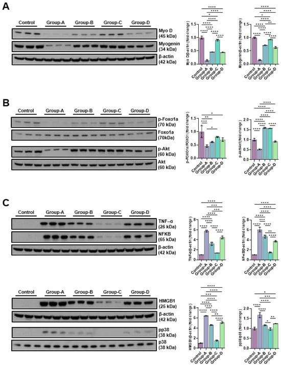 Western blotting outcomes of muscle production-related proteins (Myo D and myogenin) (A), muscle atrophy suppression signaling pathway-related proteins (p-Foxo1a and p-Akt) (B), and pro-inflammatory expression-related proteins (TNF-α, NFκB, HMGB1, and pp38) (C). Group-1 (control): C2C12 myoblasts with no treatment; Group-A: C2C12 myoblasts with 10 µM dexamethasone; Group-B: C2C12 myoblasts with 10 µM dexamethasone and microcurrent with square waveform for 15 min, and then left in place for 1 day; Group-C: C2C12 myoblasts with 10 µM dexamethasone and microcurrent with sine waveform for 15 min, and then left in place for 1 day; and Group-D: C2C12 myoblasts with 10 µM dexamethasone and microcurrent with triangle waveform for 15 min, and then left in place for 1 day. * p indicates <0.05, ** p < 0.01, *** p < 0.001, and **** p < 0.0001 (post hoc intergroup tests).