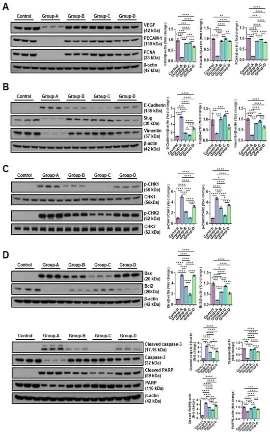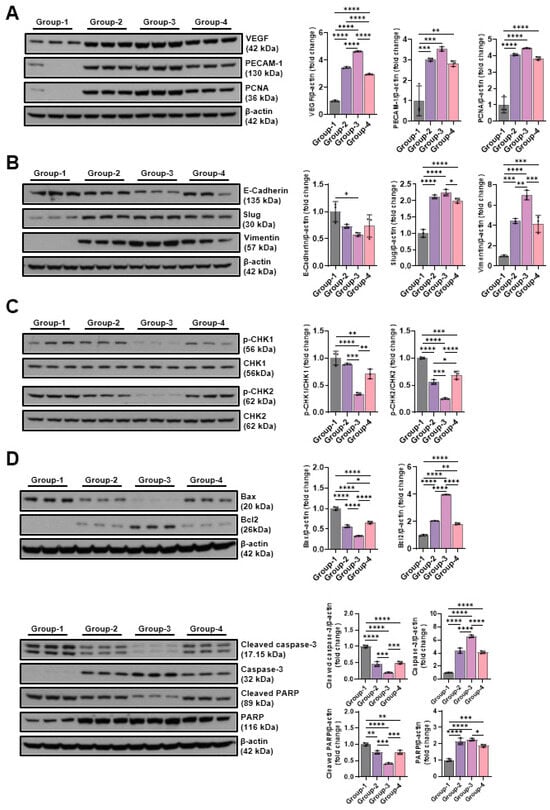Western blotting outcomes of angiogenic factor-related proteins ((A): VEGF, PECAM-1, and PCNA), EMT expression-indicative proteins ((B): E-cadherin, slug, and vimentin), DNA damage-indicative proteins ((C): p-CHK1 and p-CHK2), and apoptosis-indicative proteins ((D): BAX, Bcl-2, cleaved caspase-3, caspase-3, cleaved-PARP, and PARP). Group-1 (control): IC and sham microcurrent (MC) after cast removal (CR) for 2 weeks; Group-2: IC and MC with square waveform after CR for 2 weeks; Group-3: IC and MC with sine waveform after CR for 2 weeks; Group-4: IC and MC with triangle waveform after CR for 2 weeks. β-actin was applied as a loading control. * p indicates <0.05, ** p < 0.01, *** p < 0.001, and **** p for < 0.0001 (post hoc tests between groups).