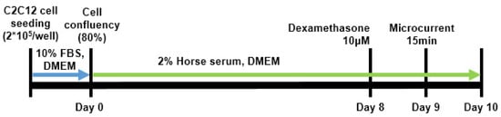 C2C12 myoblasts used in the experiment were purchased from ATCC® (C2C12 myoblasts, ATCC, Manassas, VA, USA) and cultivated in DMEM (Dulbecco’s Modified Eagle’s Medium, WELGENE, Daegu, Republic of Korea) enriched with 10% FBS (fetal bovine serum, WELGENE, Daegu, Republic of Korea) and 1% antibiotics (penicillin–streptomycin, WELGENE, Daegu, Republic of Korea) at 37 °C and 5% CO2. To promote myotube differentiation, once C2C12 myoblasts reached 80% confluency, the medium was replaced daily with DMEM containing 2% horse serum and 1% antibiotics for eight days. Meanwhile, muscle atrophy was induced using 10 µM dexamethasone (Sigma-Aldrich, St. Louis, MO, USA). After pretreatment with 10 μM dexamethasone for 24 h, cells were treated with dexamethasone alone or in combination with microcurrent for 15 min, and then left in place for 1 day (Figure 9).