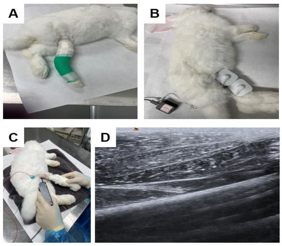 The experimental protocol was approved by the Institutional Animal Care and Use Committee (IACUC) of the Catholic University of Daegu School of Medicine and was conducted in accordance with the committee’s guidelines for the care and use of laboratory animals (Approval No. DCIAFCR-240215-03-Y). Twenty-four male New Zealand White rabbits, 12 weeks of age, with a mean body weight of 3.3 kg (ranging from 2.8 to 3.6 kg), were housed individually in stainless steel cages under controlled environmental conditions (temperature: 23 ± 2 °C; humidity: 45 ± 10%) and had free access to tap water and a commercial rabbit diet. After a one-week adaptation period, their right legs were immobilized with a cast (IC) for two weeks. Then, the casts were removed along with the hair on the lower limbs with a commercial hair remover. Subsequently, the rabbits were assigned to four groups (n = 6 per group) using a computerized randomization method. Group-1 (control): IC for 2 weeks and sham microcurrent (MC) for the same time after cast removal (CR); Group-2: IC and MC with square waveform after CR for 2 weeks; Group-3: IC and MC after CR with sine waveform for 2 weeks; Group-4: IC and MC after CR with triangle waveform for 2 weeks. The visualized sham MT was identical to the real stimulator but with no electrical current. No medication was administered, and all the animals were sacrificed two weeks after the procedure.
