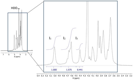 NMR spectrum of sodium alginate from Sigma Aldrich (Saint Louis, MO, USA). Intensities I1–H-1 of G, I2–H-1 of M, and H-5 of GM, and I3–H-5 of GG residues marked in the spectrum.