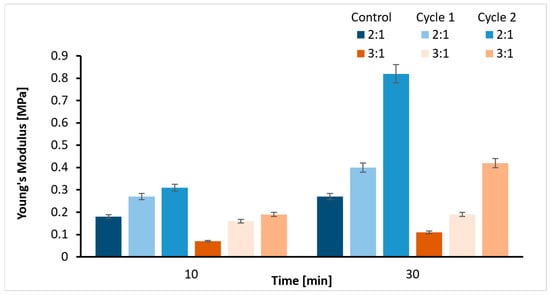 Young’s modulus values of 2:1 and 3:1 ratios with two crosslinking times (10/30 min) and heating cycles.