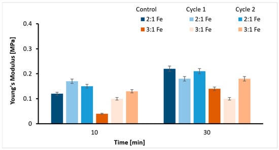 Young’s modulus values of Fe3O4 incorporated 2:1 and 3:1 ratios with two crosslinking times (10/30 min) and heating cycles.