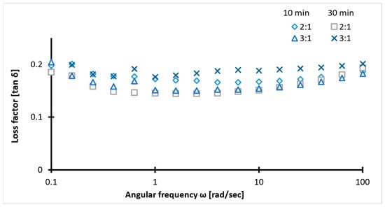 Loss factor data of 2:1 and 3:1 ratios for two crosslinking times (10/30 min).