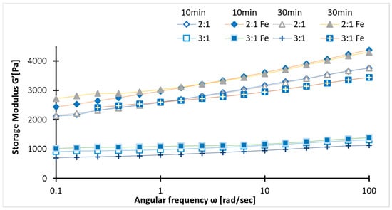 Storage modulus (G′) values of 2:1 and 3:1 ratios (with/without magnetite) for two crosslinking times (10/30 min).