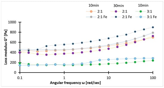 Loss modulus (G″) values of 2:1 and 3:1 ratios (with/without magnetite) for two crosslinking times (10/30 min).