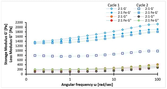 Deviations of storage (G′) and loss modulus (G″) values of 2:1 ratio (with/without magnetite) crosslinked for 10 min when subjected to heating cycles.