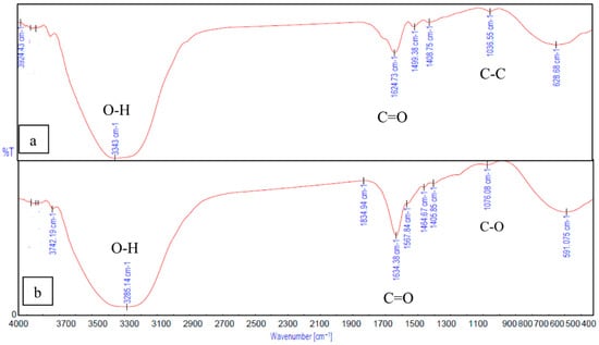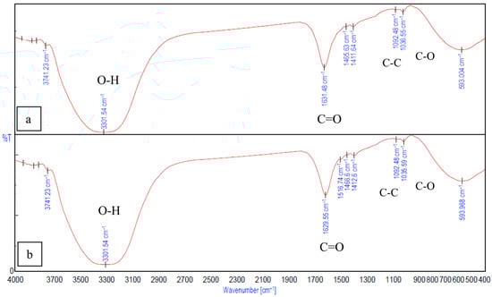 The interactions between gelatin and sodium alginate, the effect of crosslinking, and the binding of Fe3O4 to gelatin and alginate were confirmed and analyzed using peaks from the FTIR spectrum. In Figure 8b, the peak observed at 1634.38 cm−1 is from the C=O stretching vibration associated with gelatin. The peaks at 1464.67 cm−1 and 1567.84 cm−1 correspond to the functional groups of gelatin, resulting from the aliphatic C-H stretching vibration and from the combination of C=O stretching and -NH bending vibrations (amide), respectively [,]). In Figure 9a, the peaks at 1624.73 cm−1 and 1499.38 cm−1 correspond to the stretching vibration associated with carboxylic acid salts [,]) and are specific to ionic binding []. The peaks related to the pyranose ring of alginate can be observed within 1200–960 cm−1 []. The peaks at 3285.14 cm−1 and 3343 cm−1 (Figure 8b and Figure 8a) correspond to the O-H stretching of hydroxyl groups in gelatin and alginate, respectively.