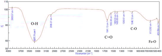 In the FTIR spectrum of Gel-SA hydrogel crosslinked for 10 min and 30 min (Figure 9), broadening peaks at 3301.54 cm−1 represent the O-H stretching band. This suggests the formation of hydrogen bonding between the polymers. The peaks at 1624.73 cm−1, 1499.38 cm−1 of alginate and the peak at 1634.38 cm−1 associated with amide vibration in gelatin are fused into one peak at 1629.55 cm−1 [,,]. The peaks at 1036.55 cm−1 from C-C stretching observed in alginate and 1076.08 cm−1 from C-O stretching in gelatin are both observed, at 1035.59 cm−1 and 1092.48 cm−1 in the 2:1 Gel-SA spectrum. This confirms effective miscibility and interactions of gelatin and alginate. In the FTIR spectrum of Gel-SA crosslinked hydrogels, the peak at 1567.84 cm−1 of gelatin shifted to a lower wavenumber 1516.74 cm−1, which corresponds to -C=O stretching and -NH bending vibrations from electrostatic interactions with alginate. The complex formation of Fe3O4 with alginate is confirmed from the characteristic band of Fe-O at 422.33 cm−1, 612.88 cm−1, and the redshift of the alginate carboxyl stretching peak from 1624.73 cm−1 to 1653.66 cm−1. O-H stretching vibration observed at 3375.78 cm−1 confirms the hydrogen-bonded interactions. In Figure 10b, the spectrum of gelatin-Fe3O4 solution indicates the stretching of C=O and Fe-O at 1641.13 cm−1 and 416.549 cm−1 []. In Figure 11, the peak at 429.084 cm−1 confirms the presence of magnetite nanoparticles in Gel-SA-Fe3O4 hydrogel. IR peaks in the range 1200–1800 cm−1 and below 800 cm−1 suggest that magnetite particles are polymer-coated.