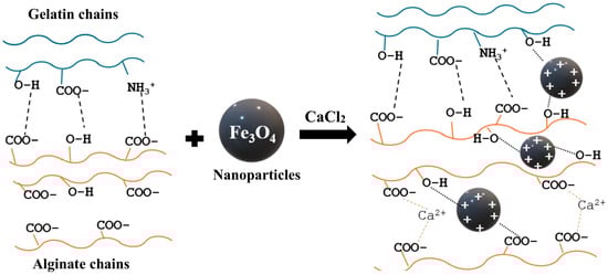 However, achieving the mechanical properties and structural stability required for tissue engineering, solely utilizing gelatin and alginate without overlooking biocompatibility, remains a challenge. This fact raises the question of fabricating gels by using additives or fillers to overcome this drawback. Incorporating nanomaterials into the scaffold enhances their functionality. Some commonly used nanomaterials for tissue engineering include carbon-based materials, metal and metal oxide nanoparticles, bio ceramic nanoparticles, polymeric nanoparticles, and nanofibers []. The addition of carbon-based nanomaterials has already proven to improve the mechanical properties of hydrogels [,]. Nanomaterials are particularly valued for their high surface area-to-volume ratio that promotes higher binding capacity and dispersibility in solution, which can significantly influence cellular functions such as adhesion, proliferation, and differentiation [,]. Magnetite (Fe3O4) nanoparticles are gaining increasing attention in tissue engineering due to their biocompatibility, ease of coating and functionalization, antimicrobial property, and magnetic stimuli response [,]. The trivalent (Fe3+) and divalent (Fe2+) cations in magnetite have heavy and soft metal cationic behavior, respectively. Trivalent cations bind to negatively charged ligands like carboxylate groups and divalent ions poorly crosslink neutral ligands [,]. Hence, incorporating Fe3O4 nanoparticles in a polymeric system can enhance colloidal stability and improve the biocompatibility of nanoparticles through surface functionalization.