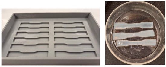 The mechanical strength of the synthesized hydrogels was tested using the Uniaxial SHIMADZU AUTOGRAPH AGS-X (Columbia, MD, USA) tensile machine with a crosshead speed of 0.02 mm/s. The tensile tests were carried out at room temperature on dog-bone-shaped samples made from a Teflon mold (Figure 13), as per the ASTM D412 standard for dumbbell and straight section specimens, used on a tabletop universal testing machine [].