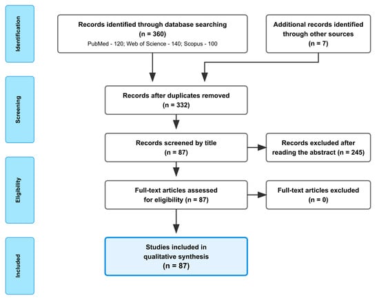 Equivalent search phrases were used across bibliographic databases (Scopus, Web of Science, and Embase) as well as publishing platforms (Springer, Elsevier, Wiley, Taylor & Francis, Oxford University Press, Cambridge University Press, Nature, Ibuk, and LEX). The systematic literature search was conducted following the PRISMA 2020 guidelines. A total of 360 records were initially identified through electronic database searching. After removing duplicates, 332 records were screened, and 87 full-text articles were included (Figure 1).