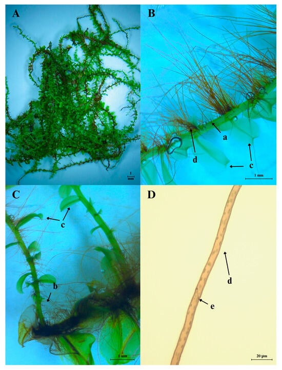 A clump of P. affine moss (A), unbranched (B) and branched (C) stems with spirally arranged (helically) leaves, and (D) rhizoids, as well as part of a rhizoid with a septum. a, unbranched stem; b, branched stem; c, leaves; d, rhizoids; e, septum.