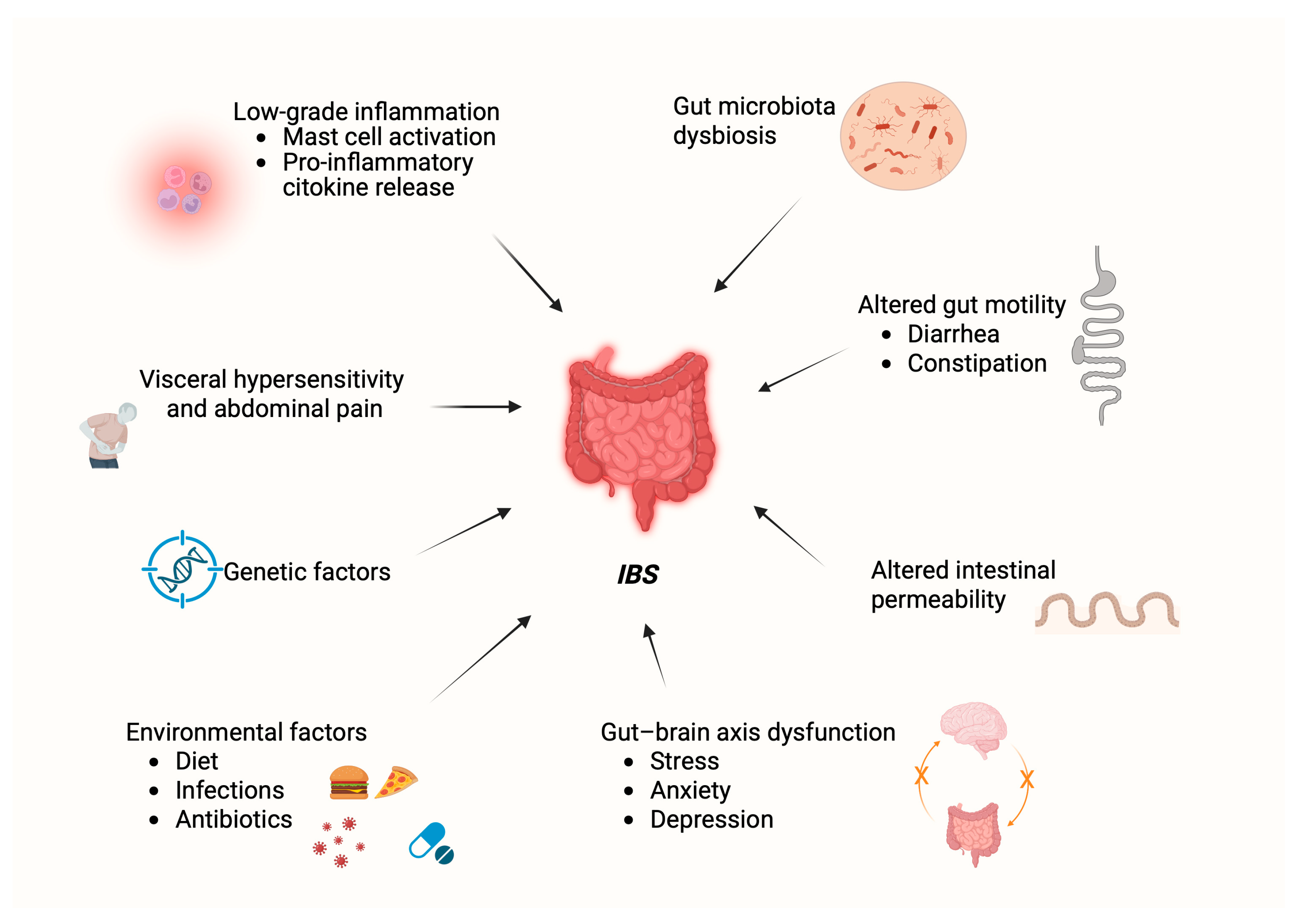 - Pellegrino, R.; Gravina, A.G. Irritable Bowel Syndrome Remains a Complex Disorder of Gut-Brain Interaction: Too Many Actors on Stage. World J. Gastroenterol. 2025, 31, 101357. [Google Scholar] [CrossRef]