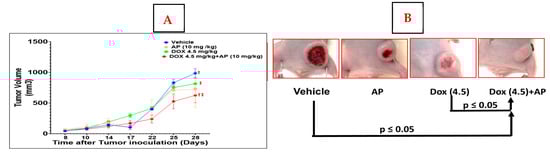 We determined that there was a significant decrease in tumor volumes in the Dox (4.5 mg/kg) + AP (10 mg/kg) versus the vehicle and the Dox alone (4.5 mg/kg) groups (p ≤ 0.05, two-way ANOVA/Tukey’s test). Although AP alone caused a decrease in tumor volume compared to the vehicle group, the difference was not significant. There were no significant differences betwen the Dox (2.5 mg/kg) with and without AP. Compared to the Dox (4.5mg/kg) alone and the vehicle groups, the mean tumor volume in the Dox (4.5 mg/kg) + AP group at the end of experiment was significantly decreased (Figure 1A,B; Dox (4.5 mg/kg); 816 ± 220 mm3, n = 6 vs. Dox (4.5 mg/kg) + AP (10 mg/kg); 623 ± 291 mm3, n = 6 (‡; p = 0.0148, two-way ANOVA with Tukey’s post hoc test); vehicle; 985 ± 167 mm3; n = 5 vs. Dox (4.5 mg/kg) + AP (10 mg/kg); 623 ± 291 mm3, n = 6 (†; p = 0.0321, two-way ANOVA with Tukey’s post hoc test).