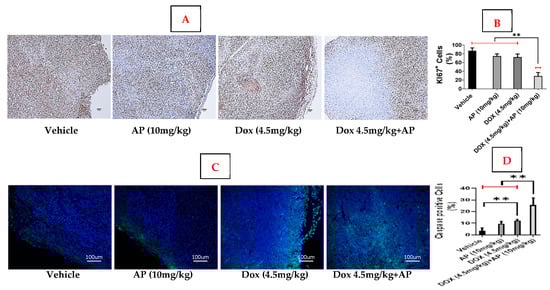 Other studies have shown that in TNBC patients, the most relevant cutoff value for Ki-67 (the proliferation marker) for prognosis is 30% (p = 0.008). At the cutoff point of 30%, worse disease-free survival (DFS) and overall survival (OS) were observed in the Ki-67highK group []. We determined that the Ki-67 index, reported as the percentage of nuclear staining-positive cells (at least 1000), was 87.33% ± 6.42 in the untreated vehicle group, 75% ± 5 in the AP alone group, and 72.33% ± 7.5 in the Dox alone group. The Ki-67 index was significantly lower in the Dox (4.5 mg/kg) + AP group (29% ± 8.48) vs. the Dox (4.5 mg/kg) and vehicle groups (p ≤ 0.01, one-way ANOVA with Tukey’s post hoc test; n = 2–3); see Figure 2A,B.