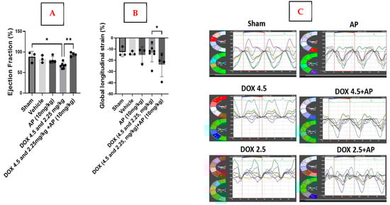 We determined the effects of AP on Dox-induced cardiotoxicity. We firstly determined that there was a significant decrease in the ejection fraction (EF) in response to Dox (4.5 mg/kg and 2.25 mg/kg) versus the sham (sham; 87.64 ± 9.6%, n = 3 vs. Dox (4.5 mg/kg and 2.25 mg/kg); 66.88 ± 6.74%, n = 7; *, p = 0.0120, Kruskal–Wallis with Dunn’s post hoc test). Most importantly, the addition of AP to the Dox regime led to a significant increase in the mean EF compared to the Dox group without AP (Figure 3A; Dox (4.5 mg/kg and 2.25 mg/kg) + AP (10 mg/kg); 94.1 ± 4.6%, n = 4 vs. Dox (4.5 mg/kg and 2.25 mg/kg); 66.88 ± 6.74%, n = 7; **, p = 0.0006, Kruskal–Wallis with Dunn’s post hoc test). Other parameters, such as fractional shortening, did not show significant differences between the different groups. We also performed Global Longitudinal Strain (GLS) analysis using speckle tracking echocardiography to quantify the extent to which the heart muscle shortened during left ventricular (LV) systolic contraction. GLS is more sensitive than the routinely used ejection fraction determinant and is an early indicator of myocardial dysfunction, specifically in patients that are being treated with cardiotoxic chemotherapeutic agents, such as Dox. GLS evaluates changes in length relative to the initial length (strain = final length [L]/initial length [L0]). We determined that GLS was significantly reduced upon the addition of AP to the Dox regime compared to the Dox group without AP (Figure 3B,C; Dox (4.5 mg/kg and 2.25 mg/kg) + AP (10 mg/kg); −24 ± 10.6%, n = 4 vs. Dox (4.5 mg/kg and 2.25 mg/kg); −13.49 ± 7.8%, n = 6; *, p = 0.0203, Kruskal–Wallis with Dunn’s post hoc test). There was no difference in radial strain between the different groups.