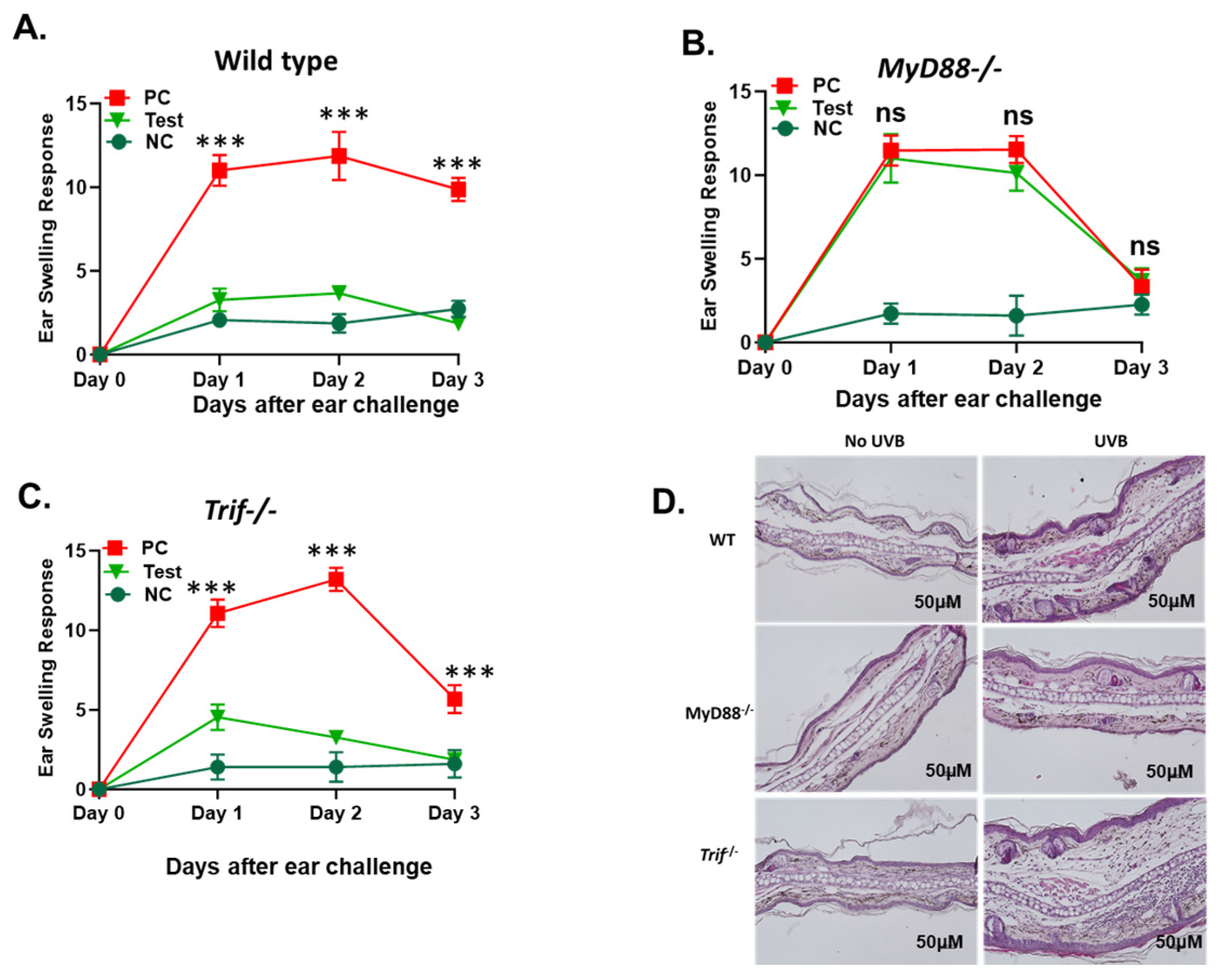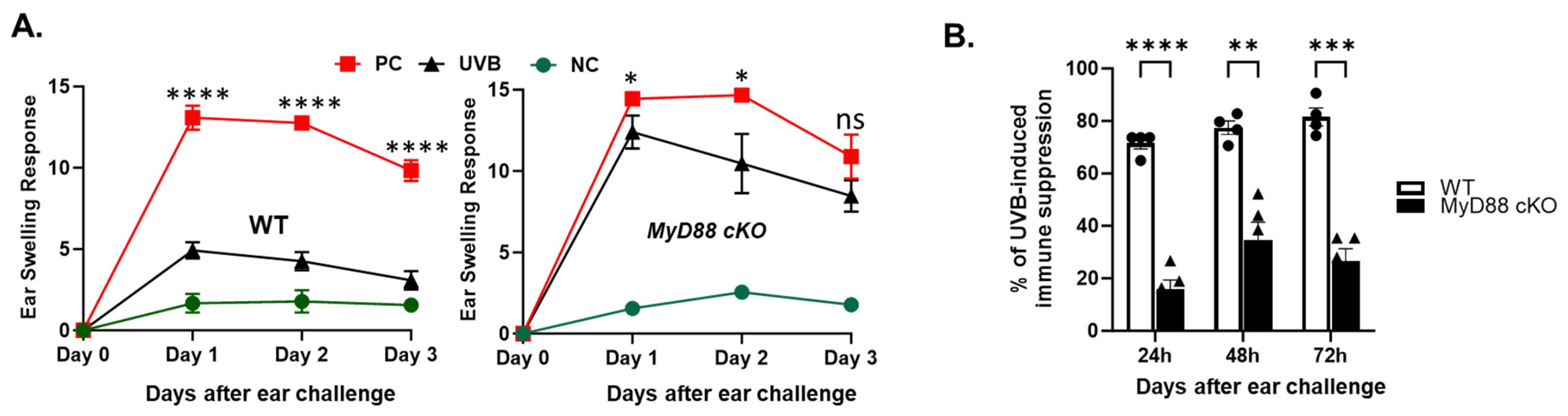 2.1. The Deficiency in the MyD88 Gene Diminishes UVB-Induced Suppression of Cutaneous Immune Responses