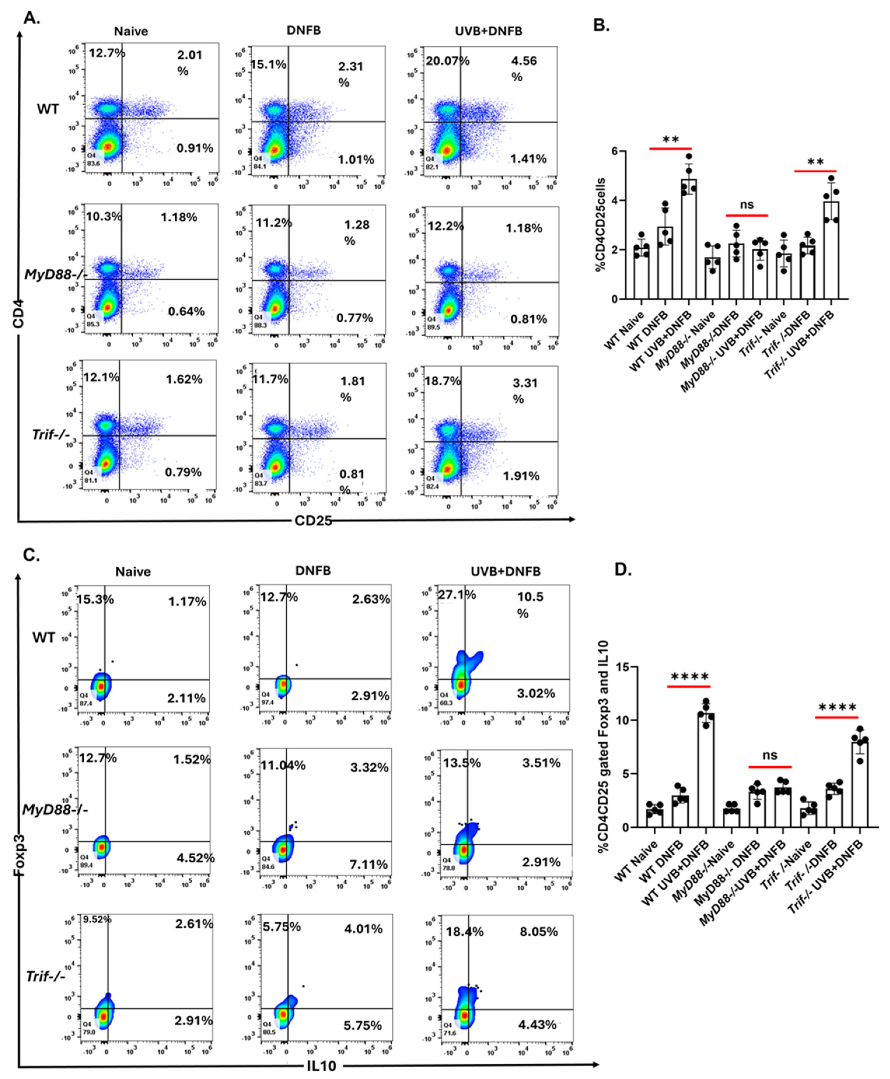 2.2. The MyD88 Deficiency Inhibits UVB-Induced Development of T Regulatory Cells