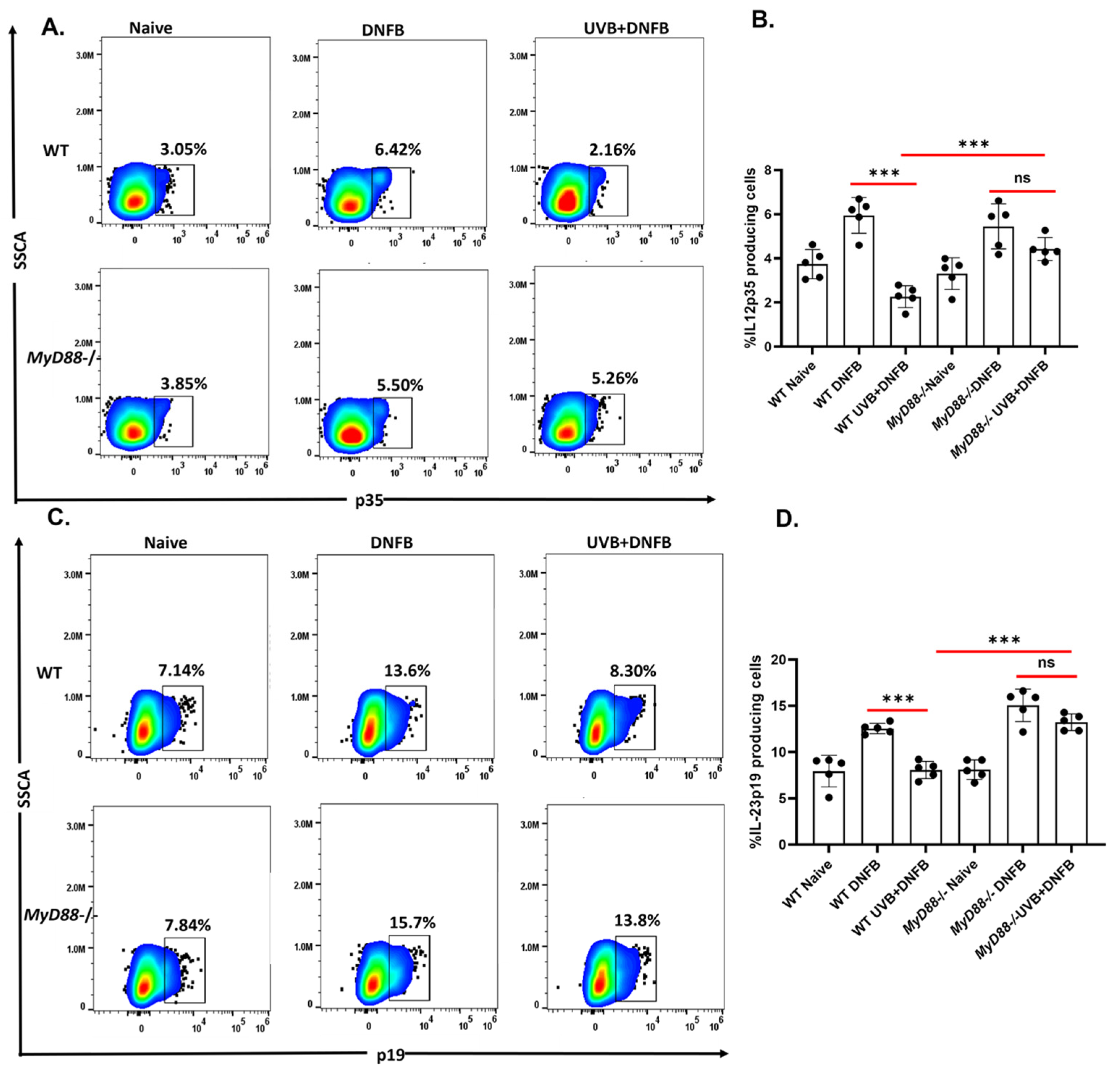 2.3. The MyD88 Deficiency Inhibits UVB-Induced Reduction of IL12p39 and IL23p19 Production by CD11c+ DC