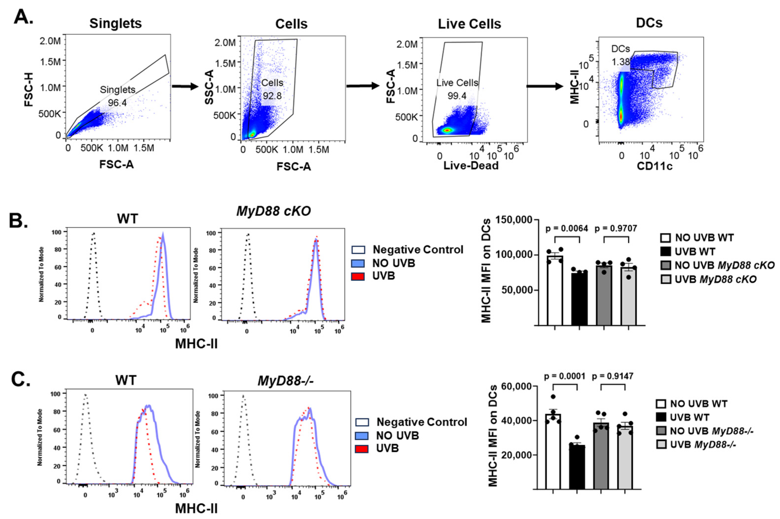 Chicago/Turabian StyleSherwani, Mohammad Asif, Carlos Alberto Mier Aguilar, Charlotte McRae, Gelare Ghajar-Rahimi, Aisha Anwaar, Ahmed Omar Jasser, Ariq Chandra, Hui Xu, and Nabiha Yusuf. 2025. "MyD88 Plays an Important Role in UVB-Induced Suppression of Dendritic Cell Activity, T Cell Function, and Cutaneous Immune Response" International Journal of Molecular Sciences 26, no. 19: 9361. https://doi.org/10.3390/ijms26199361