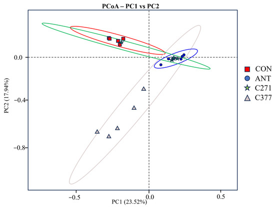 Bacillus strains. PCoA demonstrated two primary clusters: one comprising control and C271 with conserved microbiota, and another containing antibiotic and C377 groups, indicating C377’s antibiotic-mimicking effects on microbial composition, possibly due to antimicrobial action.