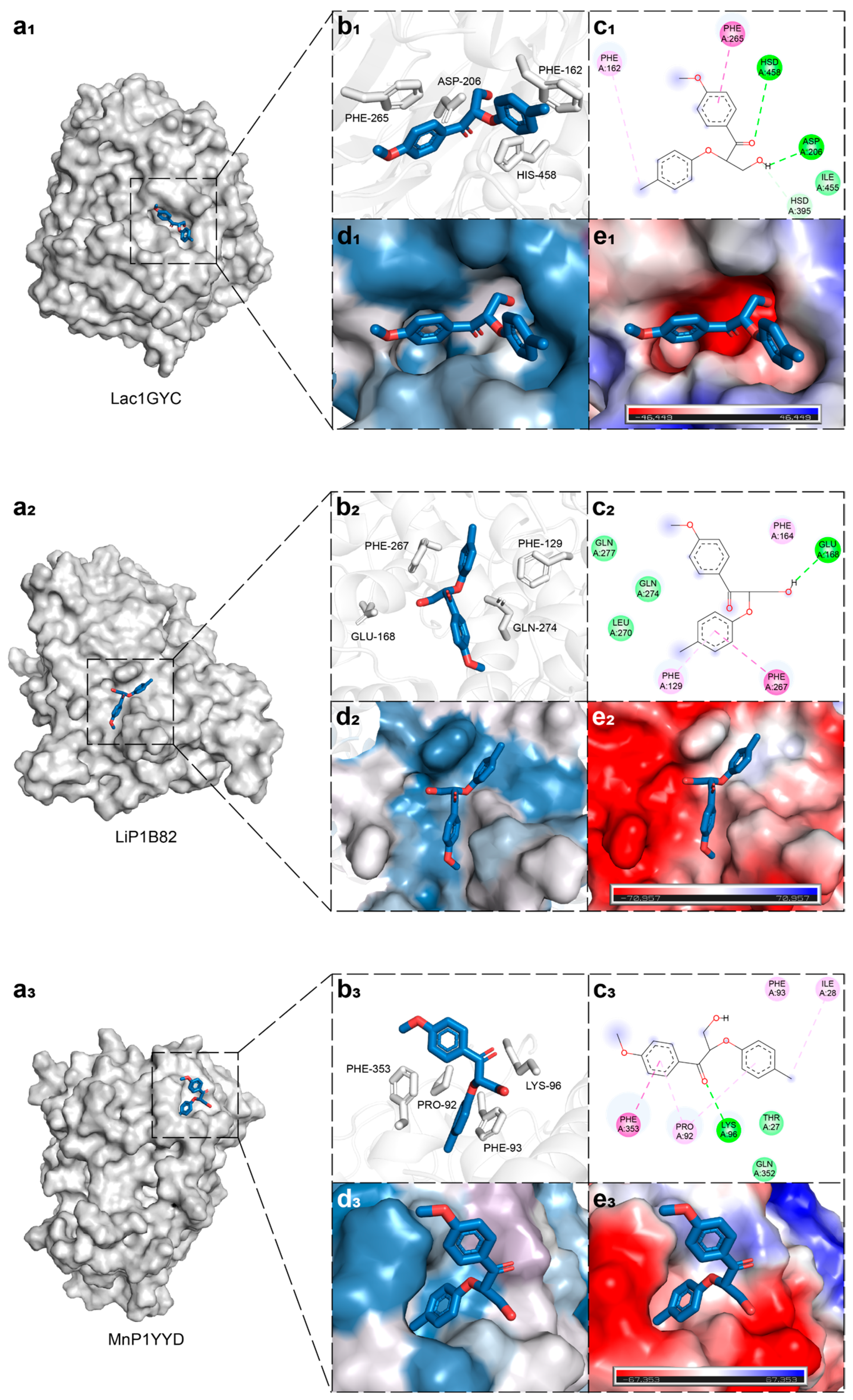 - Wang, Y.; Guo, M.; Zheng, Y.; Zhao, X.; Li, B.; Huan, W. Atomic-scale investigation of the interaction between coniferyl alcohol and laccase for lignin degradation using molecular dynamics simulations and spectroscopy. J. Dispers. Sci. Technol. 2018, 40, 686–694. [Google Scholar] [CrossRef]