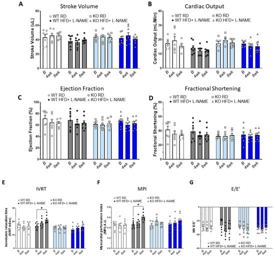 Cardiac systolic and diastolic functions assessed by echocardiography in WT and TRPC6 KO. (A) Stroke volume, (B) cardiac output, (C) ejection fraction, (D) fractional shortening, (E) isovolumic relaxation time, (F) myocardial performance index, and (G) E/e’, measurements at baseline, 4 weeks, and 8 weeks after L-NAME. Results are expressed as mean ± SEM, n = 6–7, * p < 0.05 between two groups by post hoc test after two-way ANOVA. Bar colors indicate experimental groups: white = WT RD (regular diet), gray = WT HFD+L-NAME, light blue = KO RD, dark blue = KO HFD+L-NAME.