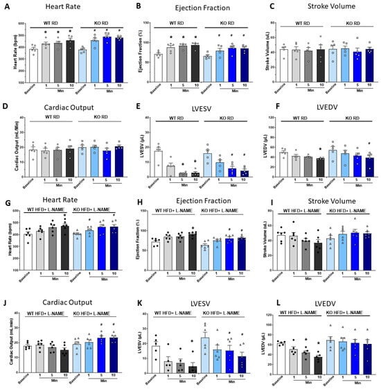 Echocardiography during dobutamine stress test. Time-dependent changes after dobutamine injection in (A) Heart rate, (B) ejection fraction, (C) stroke volume, (D) cardiac output, (E) LVESV, and (F) LVEDV in WT and TRPC6 KO mice with RD. (G–L) Heart rate, ejection fraction, stroke volume, cardiac output, LVESV, and LVEDV in WT and TRPC6 KO mice with HFD+L-NAME after dobutamine injection. Results are expressed as mean ± SEM, n = 5–6, *, p < 0.05 when compared with baseline in WT mice, #, p < 0.05 when compared to baseline in TRPC6 KO mice by post hoc test after one-way ANOVA. LVESV, left ventricular end-systolic volume; LVEDV, left ventricular end-diastolic volume. Color code: for WT RD and WT HFD+L-NAME mice, white (baseline), light gray (1 min), medium gray (5 min), dark gray (10 min) after dobutamine injection; for KO-RD and KO HFD+L-NAME mice, light blue (baseline), medium blue (1 min), darker blue (5 min), dark blue (10 min) after dobutamine injection.