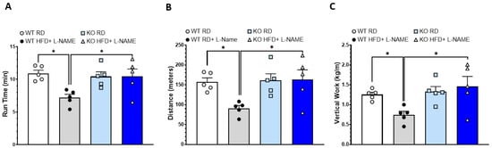 Treadmill running test in WT and TRPC6 KO mice. (A) Running time, (B) running distance, and (C) vertical work in WT and TRPC6 KO mice with RD or HFD+ L-NAME. Results are expressed as mean ± SEM, n = 5, * p < 0.05 between two groups by post hoc test after one-way ANOVA. Bar colors indicate experimental groups: white = WT RD (regular diet), gray = WT HFD+L-NAME, light blue = KO RD, dark blue = KO HFD+L-NAME.
