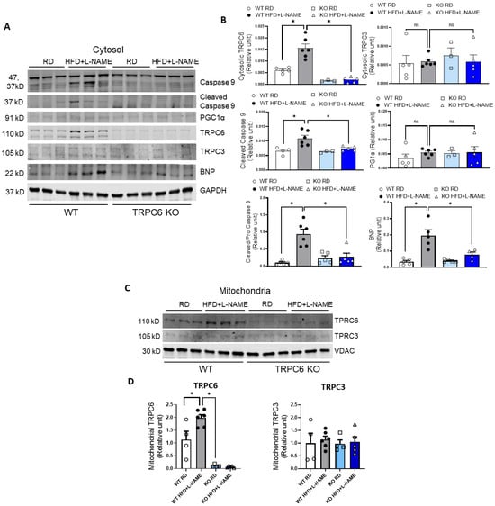We measured TRPC6, TRPC3, PGC-1α, and cleaved caspase 9 and BNP expression levels in the cytosol of cells from the left ventricle of WT and TRPC6 KO mice treated with RD or HFD+L-NAME (Figure 6A). TRPC6 expression levels in the cytosol significantly increased in WT mice after being treated with HFD+L-NAME compared to RD. In contrast, TRPC6 expression levels were very low in TRPC6 KO mice with RD or HFD+L-NAME. For TRPC3, there were no significant differences in its expression levels in WT and TRPC6 KO mice treated with RD or HFD+L-NAME (Figure 6B). We also assessed cleaved caspase 9 expression levels and the cleaved/full-length ratio of caspase 9 as an activation indicator in the mitochondria-mediated apoptotic pathway. We found that cleaved caspase 9 expression levels were significantly elevated in left ventricular samples from WT HFD+L-NAME mice compared to WT RD controls. At the same time, no increases were observed in TRPC6 KO mice treated with HFD+L-NAME (Figure 6B). Additionally, expression levels of PGC1α, a marker of mitochondrial biogenesis, were not significantly different in WT and TRPC6 KO mice on either RD or HFD+L-NAME treatment (Figure 6B). BNP expression levels, as a marker of HFpEF, were measured and showed a significant increase in WT HFD+L-NAME mice compared to WT RD controls and TRPC6 KO treated with HFD+L-NAME (Figure 6B). We further isolated the mitochondrial proteins in left ventricular samples and examined mitochondrial TRPC6 and TRPC3 expression levels in WT and TRPC6 KO mice treated with RD or HFD+L-NAME. Notably, TRPC6 expression levels in mitochondria of WT HFD+L-NAME mice showed a nearly two-fold increase compared to WT RD mice (Figure 6C,D). In contrast, TRPC3 expression remained unchanged in the mitochondria of WT and TRPC6 KO mice, regardless of RD or HFD+L-NAME treatment (Figure 6C,D). Because the TRPC6 signal detected in mitochondrial fractions is low in intensity and subcellular fractionation is inherently semi-quantitative, we interpret these immunoblots as evidence of increased enrichment of TRPC6 immunoreactivity in the mitochondrial fraction after HFD+L-NAME rather than definitive proof of intramitochondrial localization. Densitometry is reported as TRPC6 normalized to VDAC and expressed relative to WT RD.