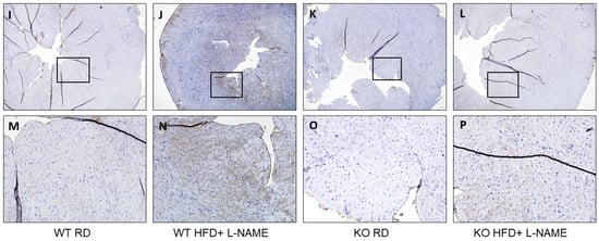 Immunohistochemistry staining of BNP and cleaved caspase 9 from the left ventricle of WT and TRPC6 KO mice with RD or HFD+ L-NAME. Representative images for BNP staining in WT RD (A,E), WT HFD+ L-NAME (B,F), KO RD (C,G), and KO HFD+ L-NAME (D,H), and cleaved caspase 9 staining in WT RD (I,M), WT HFD+ L-NAME (J,N), KO RD (K,O), and KO HFD+ L-NAME (L,P). Upper panel, ×40 magnification; lower panel, boxed regions in ×200 magnification.