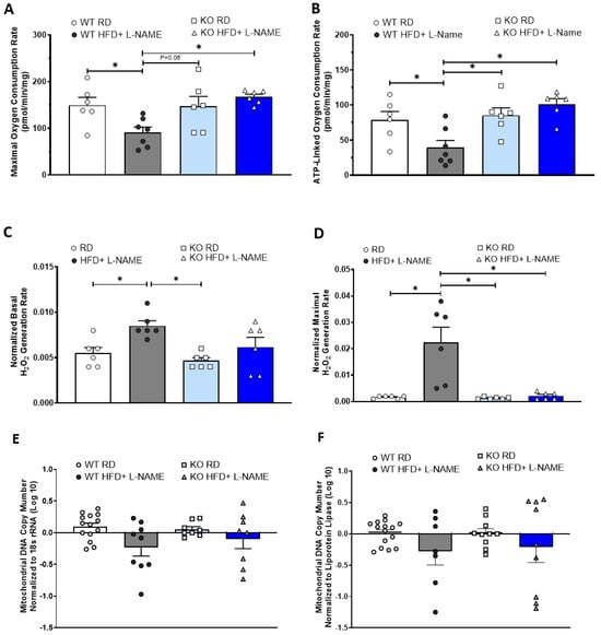 Mitochondrial respiration, mitochondria-derived H2O2 production, and mitochondrial DNA copy numbers in WT and TRPC6 KO mice. (A) Maximal oxygen consumption rate, (B) ATP-linked oxygen consumption rate, (C) basal H2O2 generation rate, and (D) maximal H2O2 generation rate measurements by Oroboros respirometer in WT and TRPC6 KO mice with RD or HFD+ L-NAME. (E,F) Mitochondrial DNA copy number normalized to 18s rRNA and lipoprotein lipase, respectively. Results are expressed as mean ± SEM, n = 6, * p < 0.05 between two groups by post hoc test after one-way ANOVA. Bar colors indicate experimental groups: white = WT RD (regular diet), gray = WT HFD+L-NAME, light blue = KO RD, dark blue = KO HFD+L-NAME.