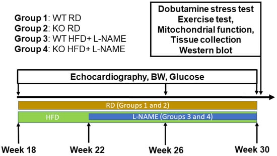 We observed moderate diastolic dysfunction, represented by a ~40% increase in IVRT and MPI in HFD+L-NAME mice compared with controls. We also performed a dobutamine stress test to evaluate cardiac function when the heart was challenged with increased workload. Dobutamine, a synthetic β-adrenergic agent, increases cardiac contractility and causes mild increases in heart rate and arterial BP. This test is commonly used in human coronary heart disease and HF diagnosis [,]. Dobutamine increased HR, SV, CO, EF, and FS in WT mice on RD. Remarkably, WT mice with HFD+L-NAME showed a gradually reduced CO and SV compared to WT control mice during the dobutamine stress test, suggesting impaired cardiac reserve despite preserved HR responses. A probable reason for reduced SV and CO in WT HFD+L-NAME mice during the dobutamine stress test, even when EF and FS were increased, could be the significantly reduced LVEDV, suggesting impaired cardiac filling during diastole. The finding of reduced cardiac reserve is further supported by treadmill exercise tests, which showed significant reductions in running distance, running time, and vertical workload in WT HFD+L-NAME mice compared to WT control mice, indicating ongoing development of cardiac dysfunction.