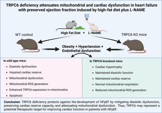 Li, X.; Fu, Y.; Dai, X.; do Carmo, J.M.; da Silva, A.A.; Mouton, A.J.; Omoto, A.C.M.; Spitz, R.W.; Wang, L.; Hall, J.E.; et al. TRPC6 Deficiency Attenuates Mitochondrial and Cardiac Dysfunction in Heart Failure with Preserved Ejection Fraction Induced by High-Fat Diet Plus L-NAME. Int. J. Mol. Sci. 2025, 26, 9383. https://doi.org/10.3390/ijms26199383