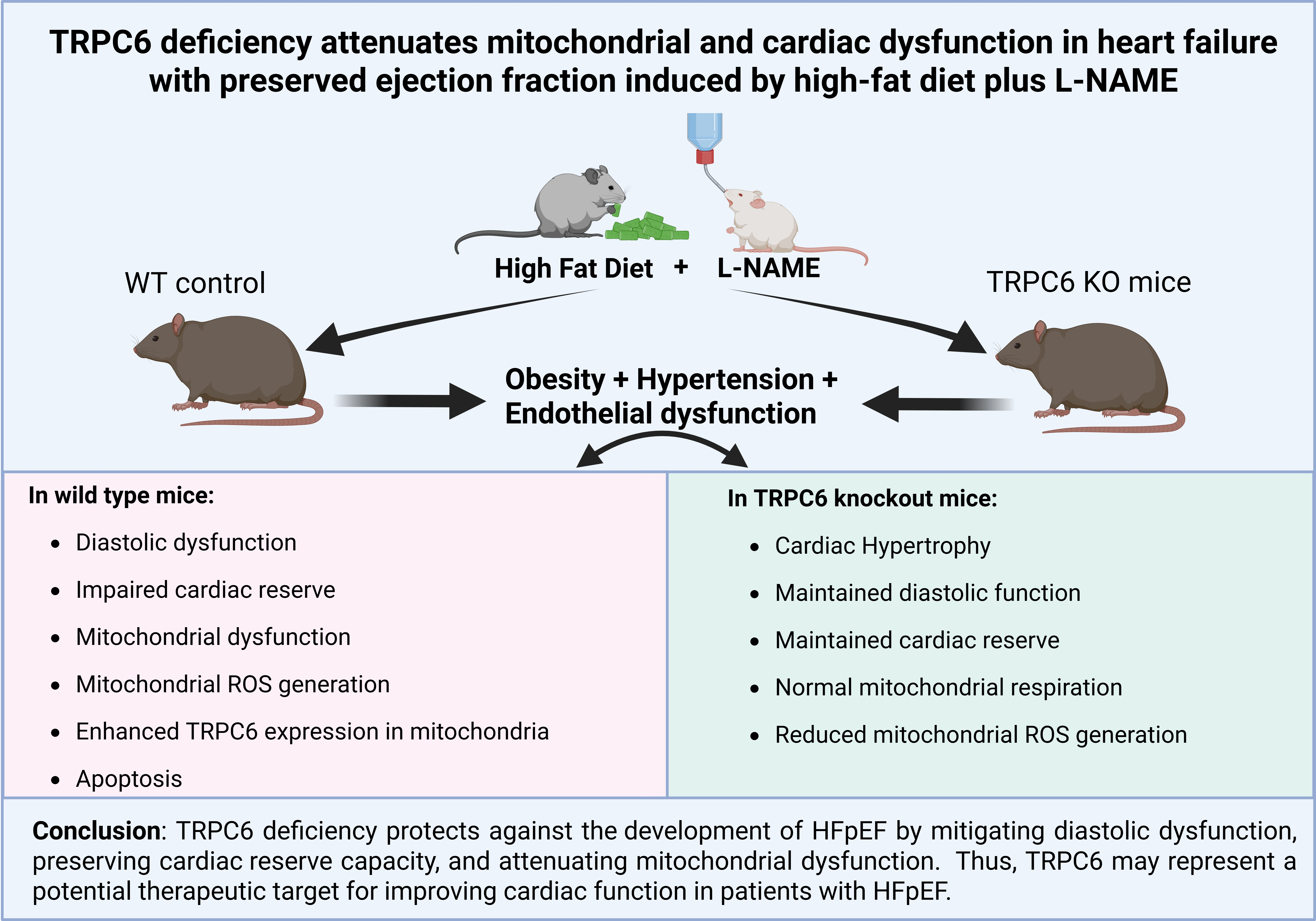 Li X, Fu Y, Dai X, do Carmo JM, da Silva AA, Mouton AJ, Omoto ACM, Spitz RW, Wang L, Hall JE, et al. TRPC6 Deficiency Attenuates Mitochondrial and Cardiac Dysfunction in Heart Failure with Preserved Ejection Fraction Induced by High-Fat Diet Plus L-NAME. International Journal of Molecular Sciences. 2025; 26(19):9383. https://doi.org/10.3390/ijms26199383