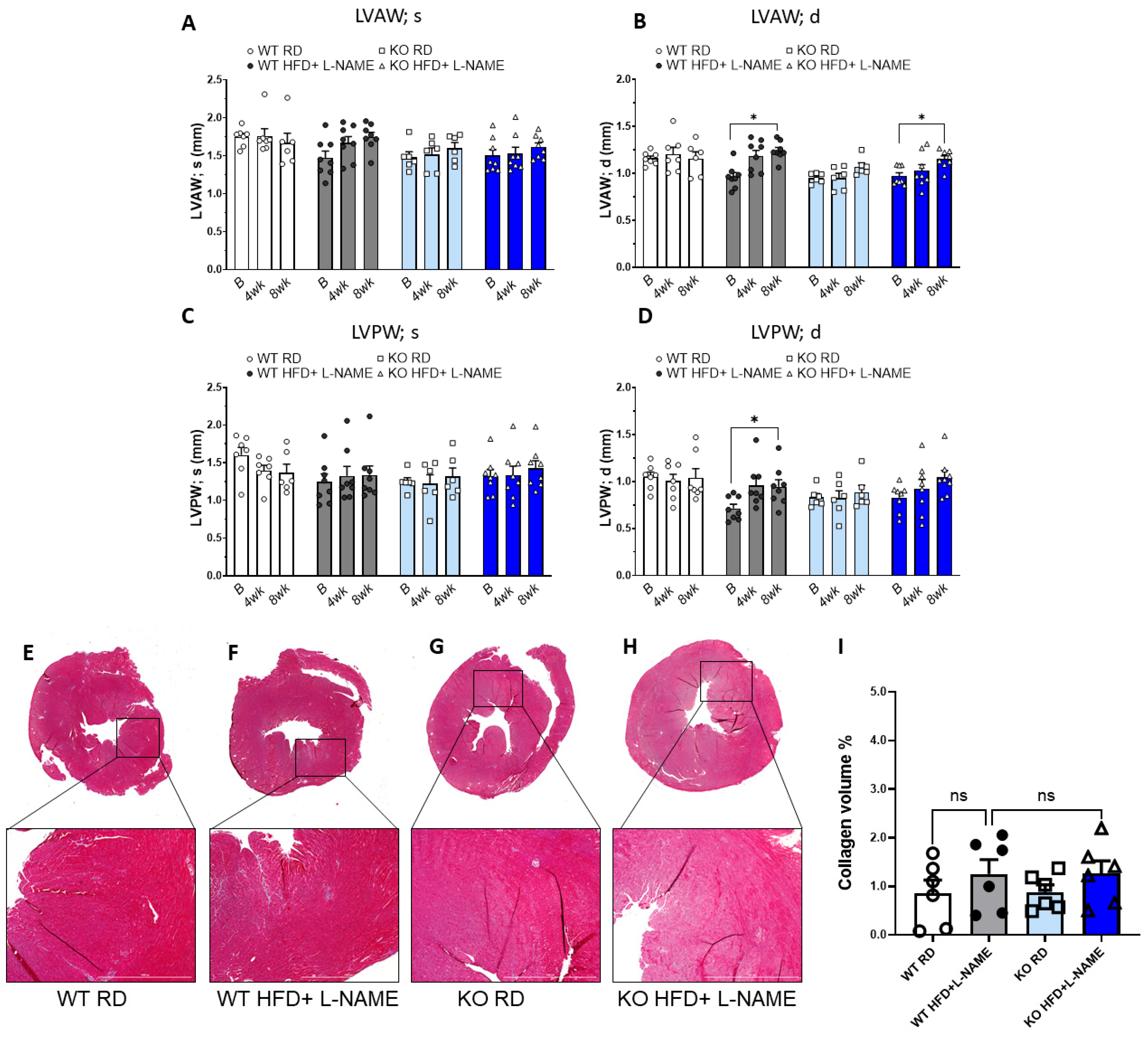 2.2. Effects of HFD+L-NAME on Cardiac Systolic Function in WT and TRPC6 KO Mice