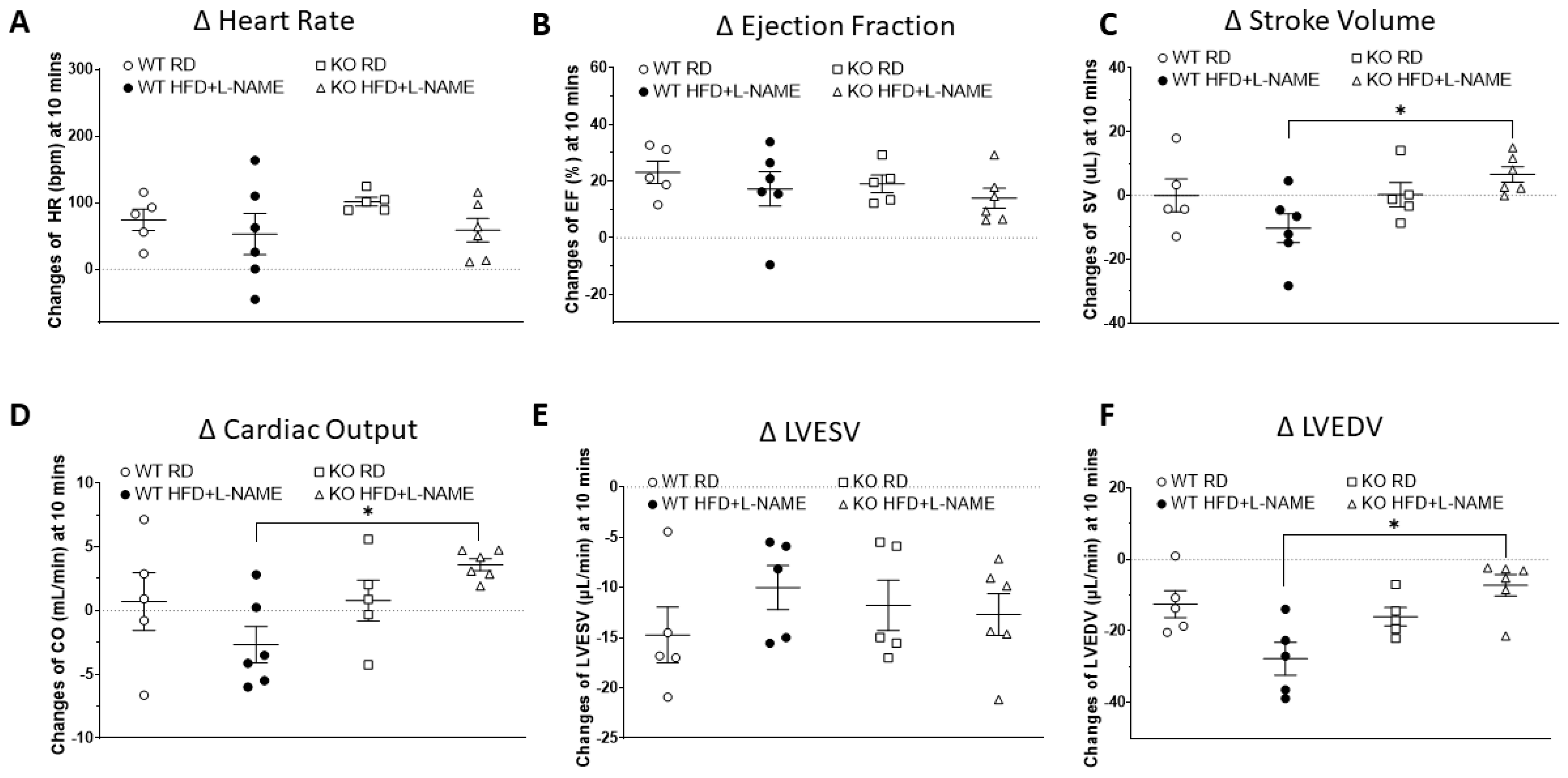 2.5. Dobutamine Stress Test Suggested Reduced Cardiac Reserve Capacity in WT but Not TRPC6 KO Mice After HFD+L-NAME
