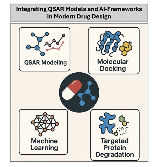 This article aims to explore the current trends in AI-augmented QSAR methodologies, highlighting key breakthroughs, and outlining emerging trends that could reshape the future of discovery and development of novel pharmaceutical products, especially with respect to small molecule compounds, such as inhibitors, degraders (PROTACS) and other modalities [9,10]. With the prospects of improving hit-to-lead timelines to designing safer and more effective drugs, the synergy between QSAR and AI is becoming the new foundation in modern drug discovery and development [11]. Recent applications highlight the role of AI-enhanced QSAR in real-world discovery. Talukder et al. integrated docking, QSAR, and simulations to investigate EGFR-targeting phytochemicals in non-small cell lung cancer [12]; Kaur et al. developed BBB-permeable BACE-1 inhibitors for Alzheimer’s disease using 2D-QSAR, docking, ADMET, and MD [13]; Souza et al. combined ML approaches and QSAR to analyze SARS-CoV-2 Mpro inhibitors [14]; and Maliyakkal et al. applied QSAR-driven virtual screening to identify potential therapeutics against Trypanosoma cruzi [15]. These case studies illustrate how QSAR continues to advance modern inhibitor discovery.