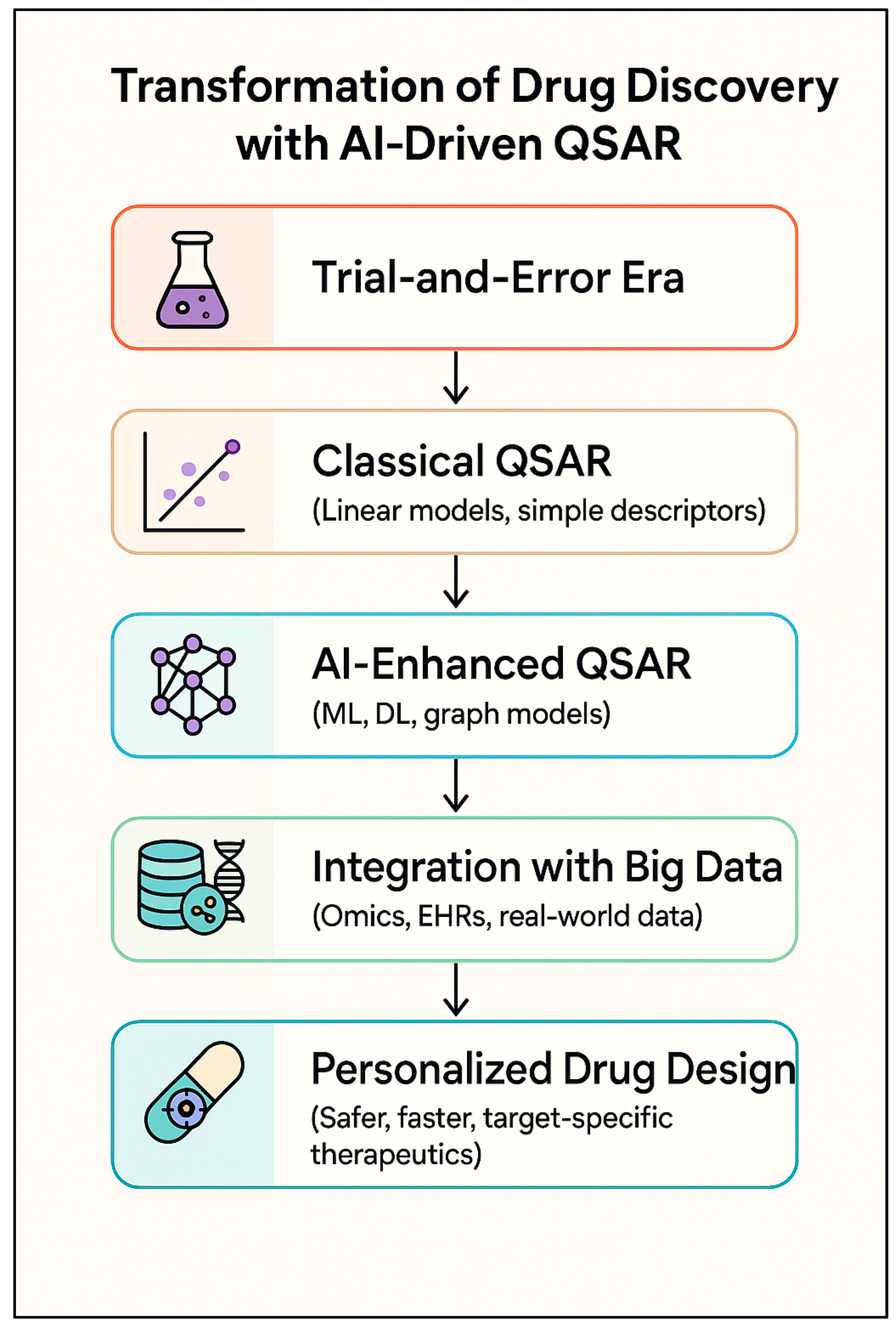 Drug discovery is undergoing a significant revolution, driven by integrating artificial intelligence (AI) into Quantitative Structure-Activity Relationship (QSAR) modeling [1,2,3,4]. Until recently, drug discovery was conducted primarily by trial-and-error, an approach that was time-consuming and burdened with high costs; currently, drug development is increasingly shaped by data-driven computational methodologies that should lead to speedier drug discovery and, ultimately, safer drugs as shown in Figure 1. Advances in QSAR have evolved from basic linear models to sophisticated machine learning (ML) and deep learning (DL) frameworks that integrate complex nonlinear patterns across large chemical spaces [1,5,6,7].