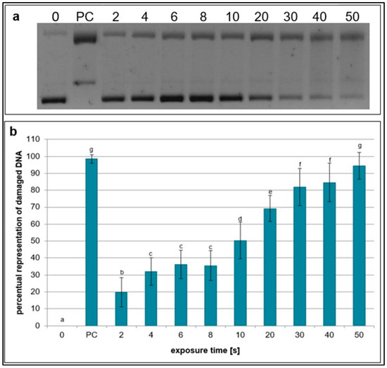 Representative gel (a) and graphical representation (b) of percentage of damaged DNA in plasmid samples exposed to NTP generated for 2 to 50 s using RPS40 plasma source assessed by DNA topology assay. PC (positive control—0.125 mM FeSO4.7H2O), 0 (negative control—sample without NTP exposure). Damaged DNA represents the amount of both SSBs and DSBs. Data are presented as mean ± SD. Statistically significant differences in the amounts of damaged DNA were determined using LSD ANOVA test at the significance level p ≤ 0.05. The significant difference between homogenous groups is depicted by a complete variation in the letters. The data are the results of twelve independent experiments.