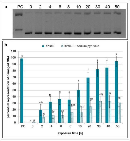 Representative gel (a) and graphical representation (b) of the percentage of damaged DNA in plasmid samples with sodium pyruvate (RPS40 + sodium pyruvate) and without a scavenger (RPS40) exposed to NTP for 2 to 50 s using RPS40 plasma source assessed by DNA topology assay. PC (positive control—0.125 mM FeSO4.7H2O), 0 (negative control—sample without NTP exposure). Damaged DNA represents the amount of both SSBs and DSBs. Data are presented as mean ± SD. Statistically significant differences in amounts of damaged DNA were determined using LSD ANOVA test at a significance level of p ≤ 0.05. The significant difference between homogenous groups is depicted by a complete variation in the letters. The data are the results of four independent experiments.