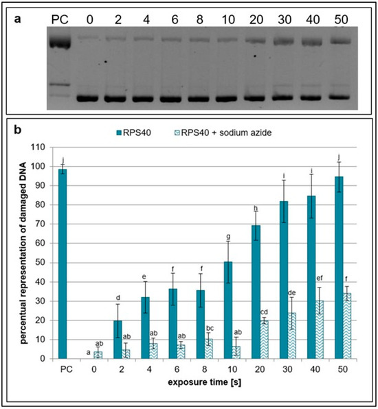 Representative gel (a) and graphical representation (b) of the percentage of damaged DNA in plasmid samples with sodium azide (RPS40 + sodium azide) and without a scavenger (RPS40) exposed to NTP for 2 to 50 s using RPS40 plasma source assessed by DNA topology assay. PC (positive control—0.125 mM FeSO4.7H2O), 0 (negative control—sample without NTP exposure). Damaged DNA represents the amount of both SSBs and DSBs. Data are presented as mean ± SD. Statistically significant differences in amounts of damaged DNA were determined using LSD ANOVA test at a significance level of p ≤ 0.05. The significant difference between homogenous groups is depicted by a complete variation in the letters. The data are the results of four independent experiments.