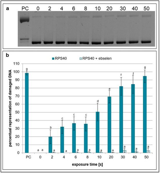 Representative gel (a) and graphical representation (b) of the percentage of damaged DNA in plasmid samples with ebselen (RPS40 + ebselen) and without a scavenger (RPS40) exposed to NTP for 2 to 50 s using RPS40 plasma source assessed by DNA topology assay. PC (positive control—0.125 mM FeSO4.7H2O), 0 (negative control—sample without NTP exposure). Damaged DNA represents the amount of both SSBs and DSBs. Data are presented as mean ± SD. Statistically significant differences in amounts of damaged DNA were determined using LSD ANOVA test at a significance level of p ≤ 0.05. The significant difference between homogenous groups is depicted by a complete variation in the letters. The data are the results of four independent experiments.