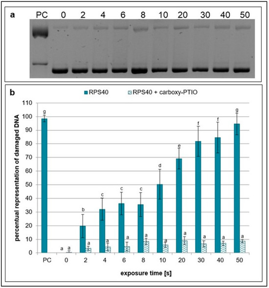 Representative gel (a) and graphical representation (b) of the percentage of damaged DNA in plasmid samples with carboxy-PTIO (RPS40 + carboxy-PTIO) and without a scavenger (RPS40) exposed to NTP for 2 to 50 s using RPS40 plasma source assessed by DNA topology assay. PC (positive control—0.125 mM FeSO4.7H2O), 0 (negative control—sample without NTP exposure). Damaged DNA represents the amount of both SSBs and DSBs. Data are presented as mean ± SD. Statistically significant differences in amounts of damaged DNA were determined using LSD ANOVA test at a significance level of p ≤ 0.05. The significant difference between homogenous groups is depicted by a complete variation in the letters. The data are the results of four independent experiments.
