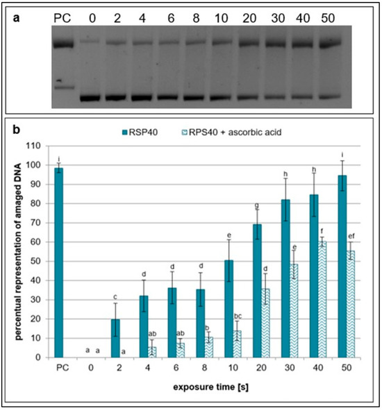 Representative gel (a) and graphical representation (b) of the percentage of damaged DNA in plasmid samples with ascorbic acid (RPS40 + ascorbic acid) and without a scavenger (RPS40) exposed to NTP for 2 to 50 s using RPS40 plasma source assessed by DNA topology assay. PC (positive control—0.125 mM FeSO4.7H2O), 0 (negative control—sample without NTP exposure). Damaged DNA represents the amount of both SSBs and DSBs. Data are presented as mean ± SD. Statistically significant differences in amounts of damaged DNA were determined using LSD ANOVA test at a significance level of p ≤ 0.05. The significant difference between homogenous groups is depicted by a complete variation in the letters. The data are the results of six independent experiments.