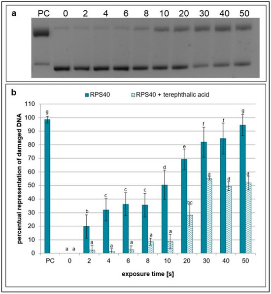 Representative gel (a) and graphical representation (b) of the percentage of damaged DNA in plasmid samples with terephthalic acid (RPS40 + terephthalic acid) and without a scavenger (RPS40) exposed to NTP for 2 to 50 s using RPS40 plasma source assessed by DNA topology assay. PC (positive control—0.125 mM FeSO4.7H2O), 0 (negative control—sample without NTP exposure). Damaged DNA represents the amount of both SSBs and DSBs. Data are presented as mean ± SD. Statistically significant differences in amounts of damaged DNA were determined using LSD ANOVA test at a significance level of p ≤ 0.05. The significant difference between homogenous groups is depicted by a complete variation in the letters. The data are the results of four independent experiments.