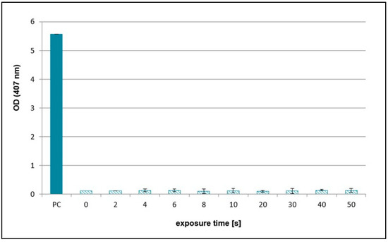 Graphical representation of hydrogen peroxide concentrations (absorbance) in reaction mixtures treated by NTP for 2 to 50 s using RPS40 plasma source. PC (positive control—25 mM hydrogen peroxide), 0 (negative control—sample without NTP treatment). Data are presented as mean ± SD. The data are the results of four independent experiments.